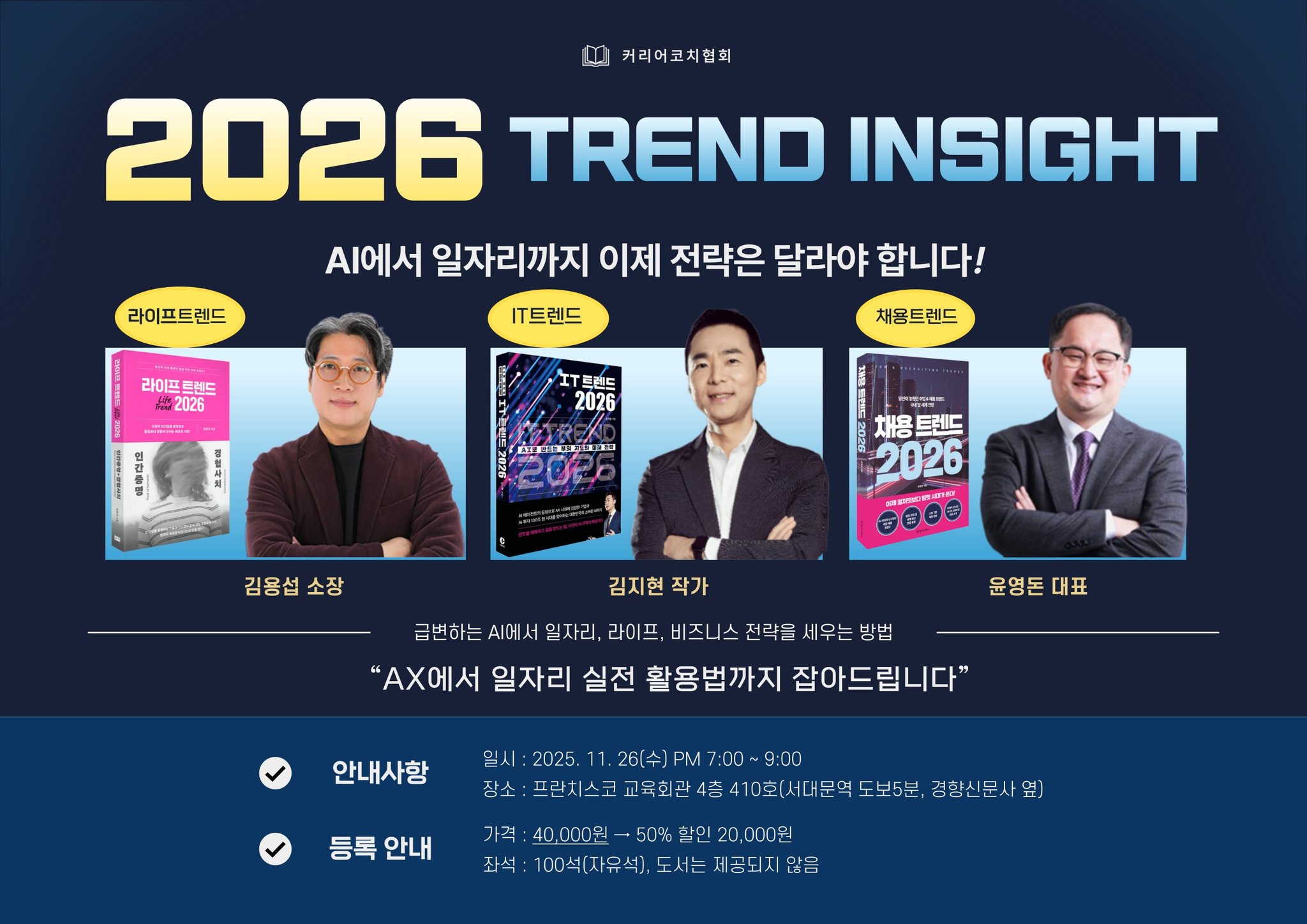 AI 시대, 기술은 모든 산업과 일상에 스며들며, 비즈니스·문화·고용의 패러다임을 바꾸고 있습니다. ‘2026 대한민국과 AX 미래 생존 전략’을 주제로, 세 명의 트렌드 저자가 한자리에 모였습니다. 라이프, IT, 채용—각 영역의 트렌드 저자들이 전하는 2026년의 결정적 변화와 생존 전략을 만나보세요. 2026년의 트렌드를 세 저자의 인사이트로 탑재하시길 바랍니다.